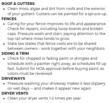 Stacia Schenk March 26, 2026 Welcome Spring….we have missed you! Stacia Schenk March 26, 2026 Here are a few ideas from our landscaper’s corner in our recent newsletter: And exterior maintenance ideas:
